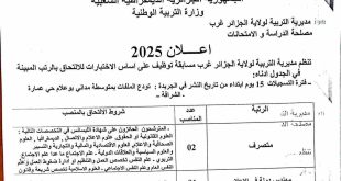- اعلان عن فتح مسابقات توظيف بمديرية التربية لولاية الجزائر غرب في مختلف التخصصات الادارية