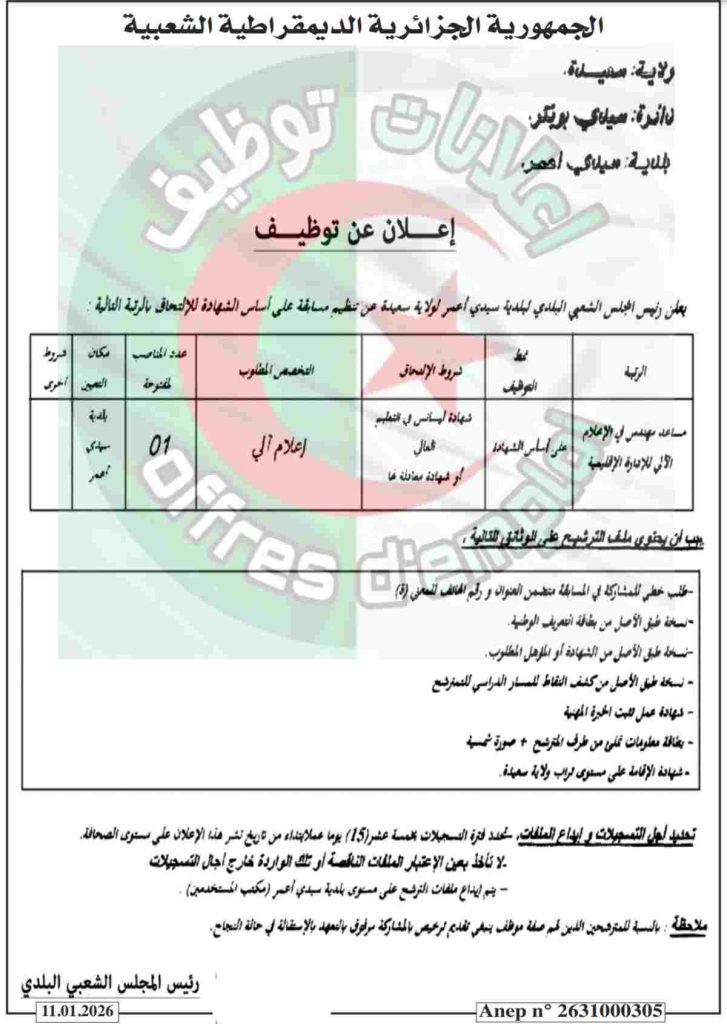 يعلن رئيس المجلس الشعبي البلدي لبلدية سيدي أعمر لولاية سعيدة عن تنظيم مسابقة على أساس الشهادة للالتحاق بالرتبة التالية: