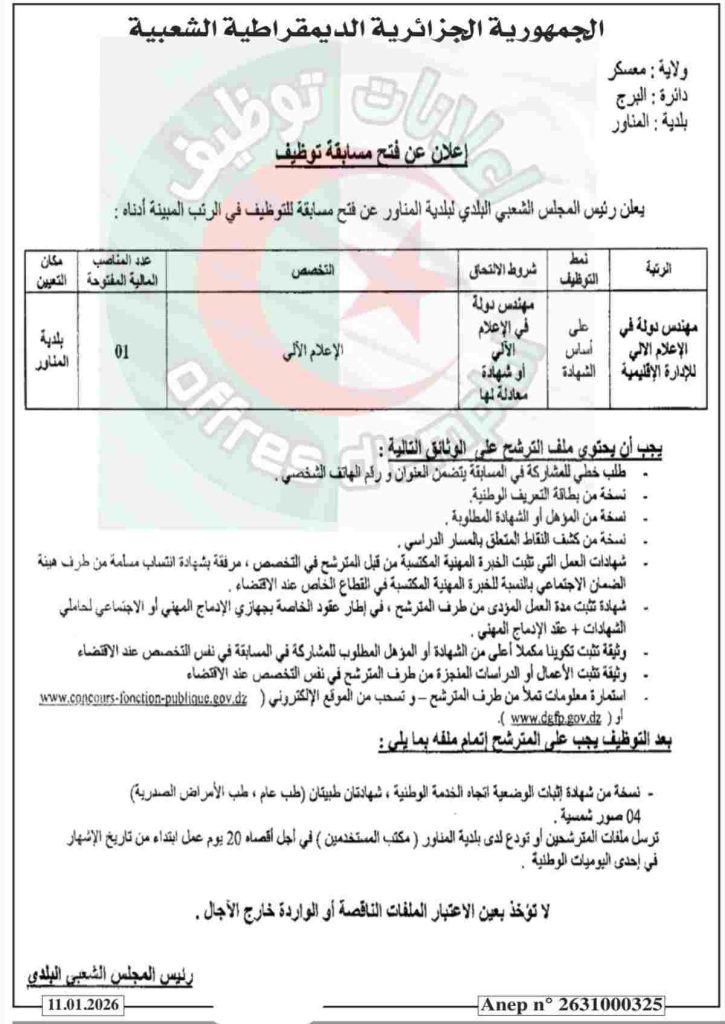 | مهندس دولة في الإعلام الآلي للإدارة الإقليمية | على أساس الشهادة | مهندس دولة في الإعلام الآلي أو شهادة معادلة لها | الإعلام الآلي | 01 | بلدية المناور |