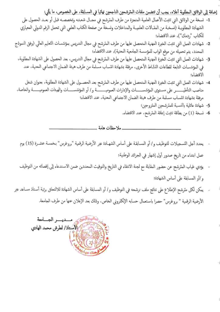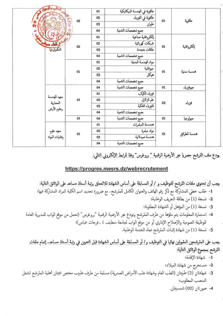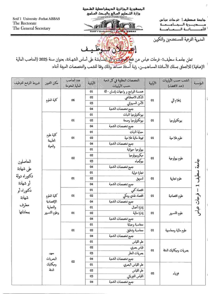 تعلن جامعة سطيف 1- فرحات عباس عن فتح التوظيف و/أو المسابقة على أساس الشهادة، بعنوان سنة 2025 (المناصب المالية الإضافية) للالتحاق بسلك الأساتذة المساعدين، رتبة أستاذ مساعد وذلك وفقا للشعب والتخصصات المبينة أدناه: