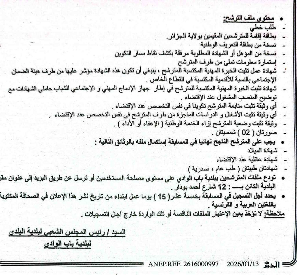 يعلن السيد رئيس المجلس الشعبي البلدي لبلدية باب الوادي عن فتح مسابقة توظيف خارجي على أساس الشهادة كما هو مبين في الجدول أدناه: