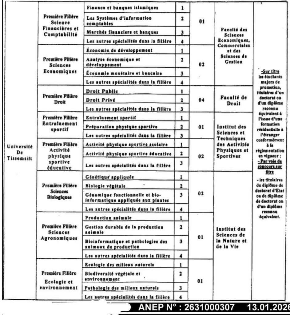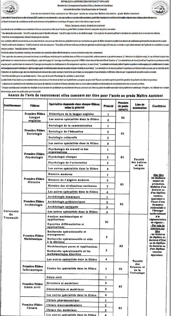 تعلن جامعة تيسمسيلت عن فتح التوظيف و/أو المسابقة على أساس الشهادة للالتحاق بسلك الأساتذة المساعدين رتبة أستاذ مساعد قسم “ب” للسنة المالية 2025 حسب التخصصات المبينة في الجدول الملحق بهذا الإعلان.