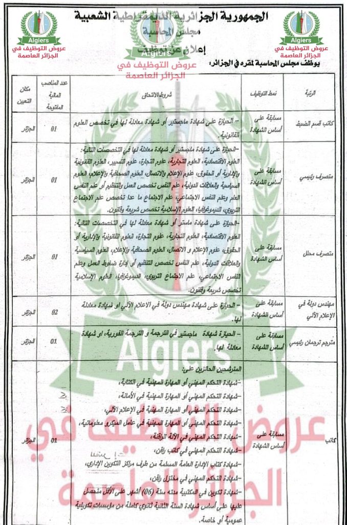 إعلان عن مسابقة توظيف على أساس الشهادة بمقر مجلس المحاسبة و الكائن مقره ب 38 نهج أحمد غرمول، الجزائر العاصمة