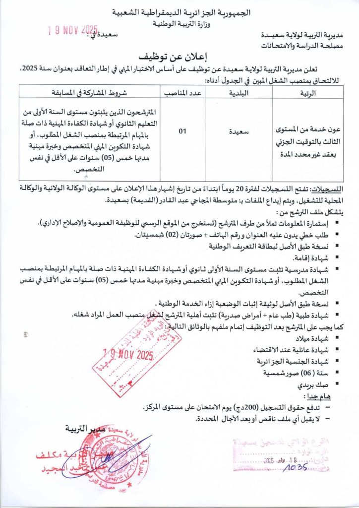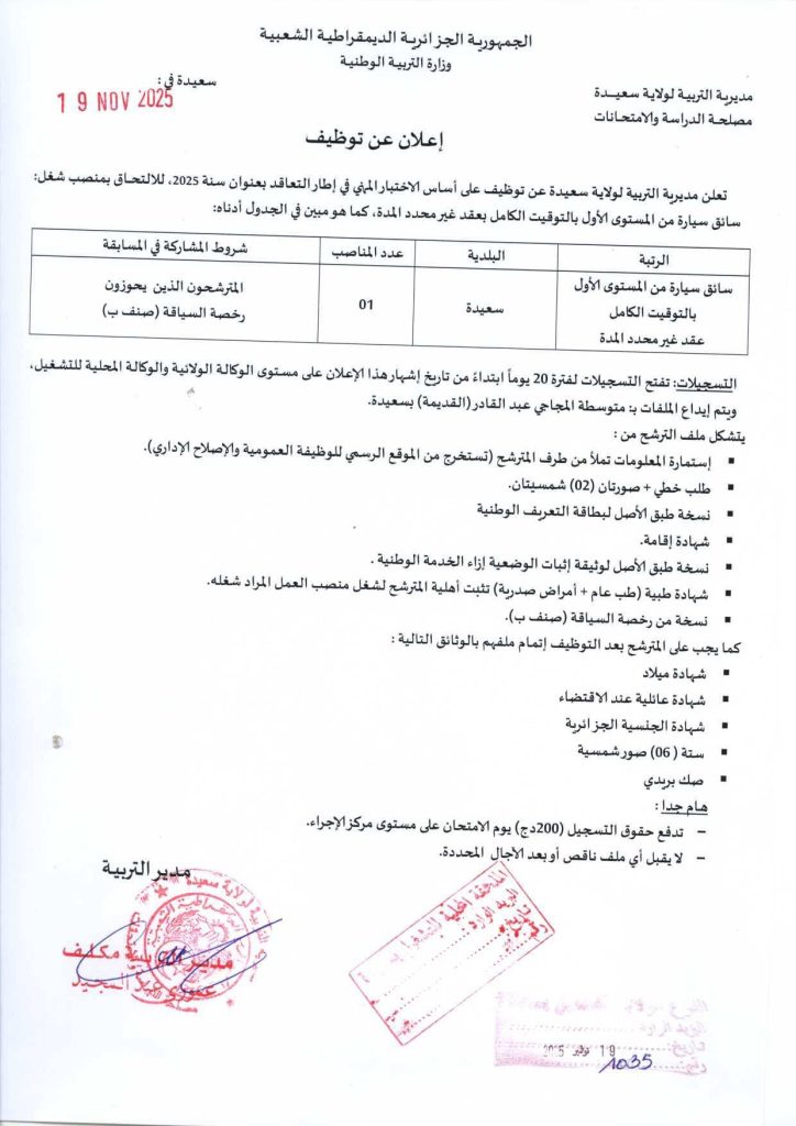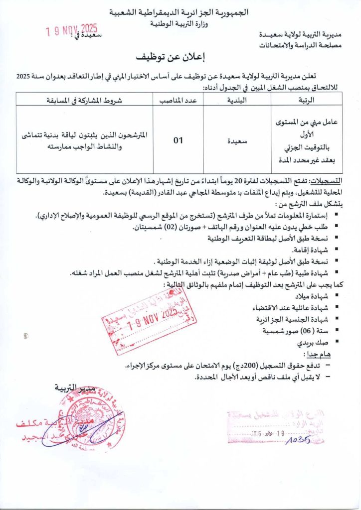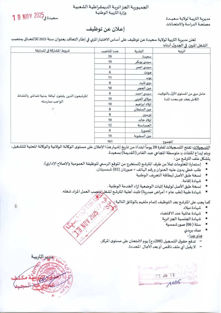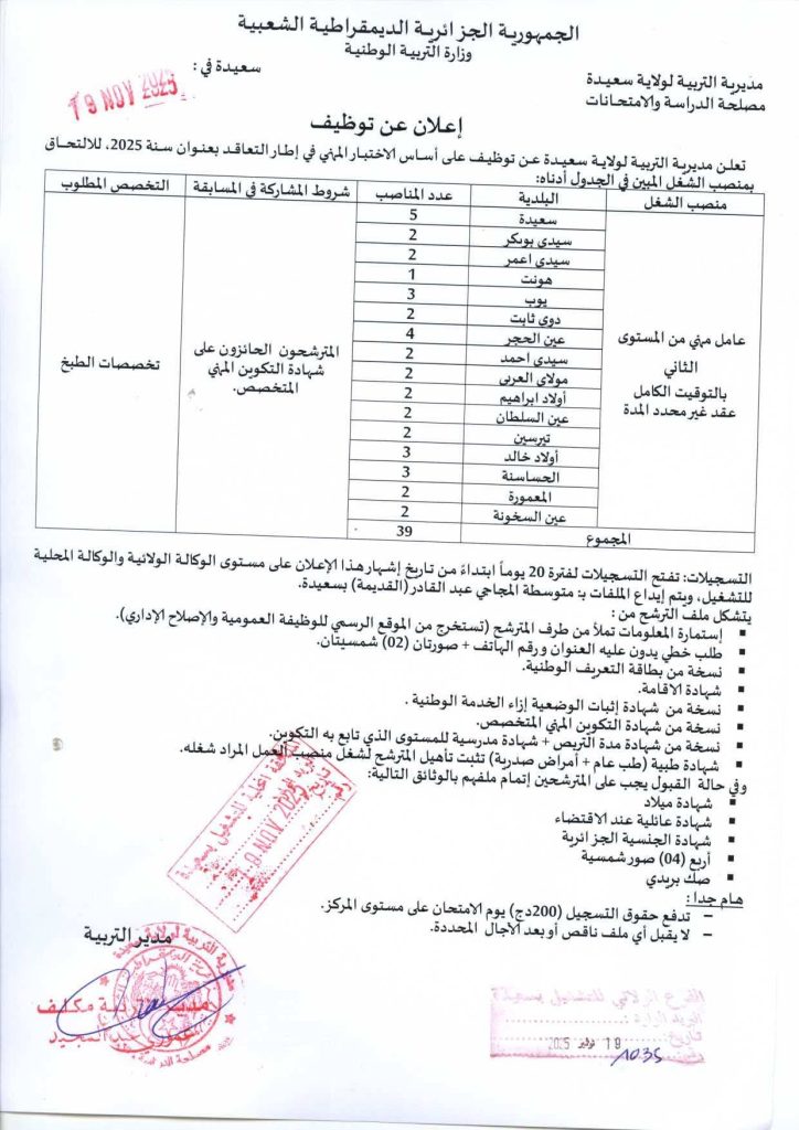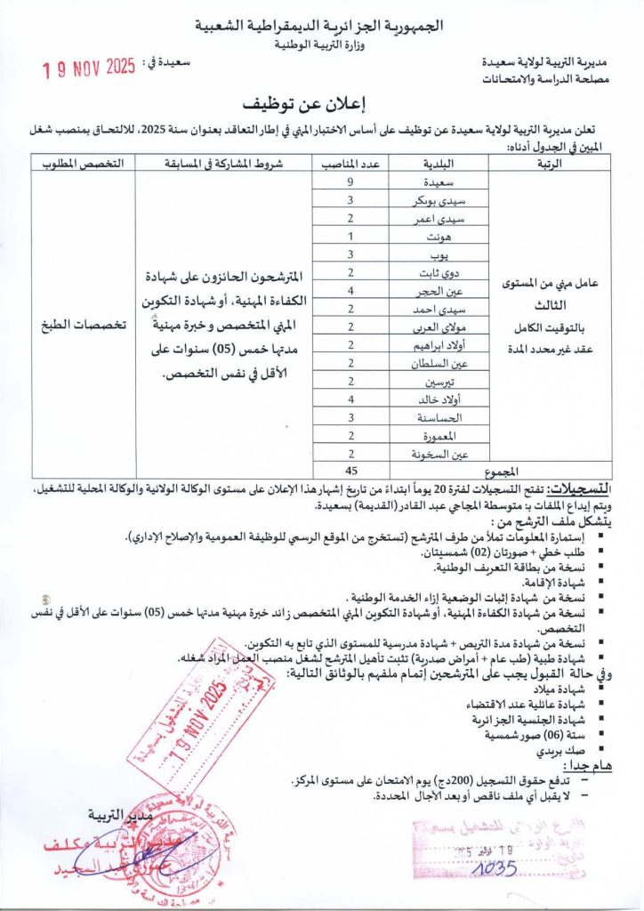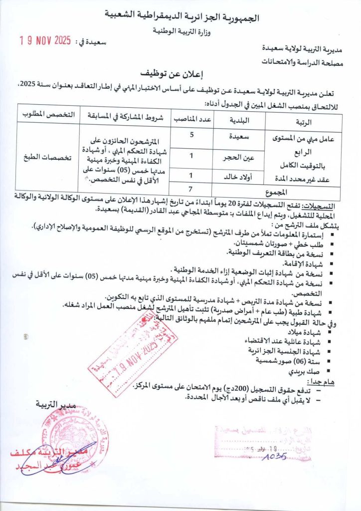 تعلن مديرية التربية لولاية سعيدة عن توظيف على أساس الاختبار المهني في إطار التعاقد بعنوان سنة 2025، للالتحاق بمناصب شغل: عمال مهنيين بعقد غير محدد المدة.