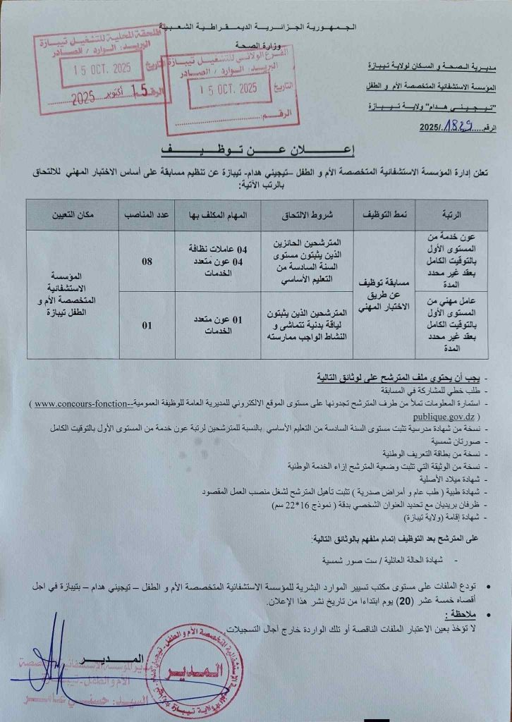 عون خدمة من المستوى الأول بالتوظيف بالتعاقد غير محدد المدة | مسابقة توظيف على طريق الإختيار المهني | المترشحون الحائزين الذين يثبتون مستوى السنة السادسة من التعليم الأساسي | 04 عاملات نظافة 04 عون متعدد الخدمات | 08 | المؤسسة الاستشفائية المتخصصة الأم و الطفل تيبازة |