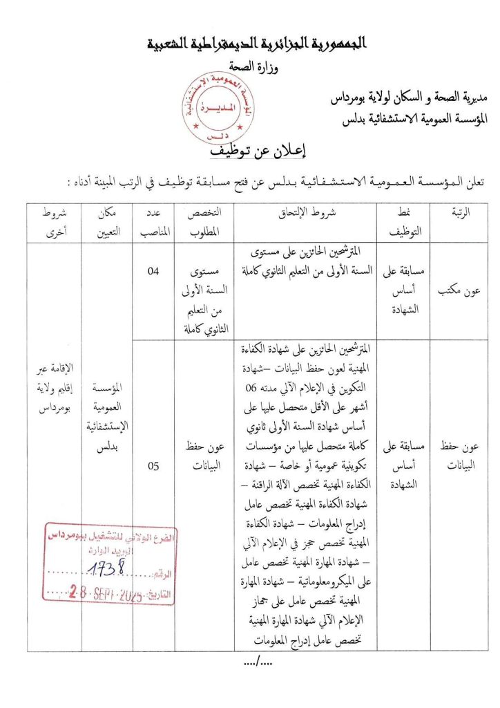 عون مكتب | مسابقة على أساس الشهادة | المترشحين الحائزين على مستوى السنة الأولى من التعليم الثانوي كاملة | مستوى السنة الأولى من التعليم الثانوي كاملة | 04 | المؤسسة العمومية الاستشفائية ب… | الإقامة عبر ولاية بومرداس |