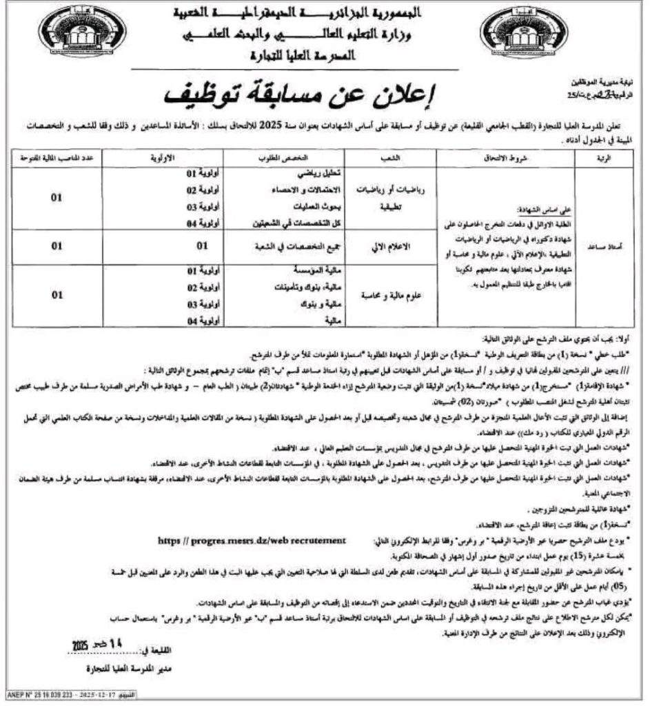 تعلن المدرسة العليا للتجارة (القطب الجامعي القليعة) عن توظيف أو مسابقة على أساس الشهادات بعنوان سنة 2025 للالتحاق بسلك: الأساتذة المساعدين وذلك وفقا للشعب والتخصصات المبينة في الجدول أدناه: