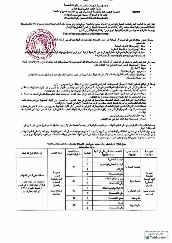 تعلن المدرسة المتعددة العلوم للهندسة المعمارية والعمران “المجاهد حسين آيت أحمد” عن توظيف و/أو مسابقة على أساس الشهادات بعنوان سنة 2025 للالتحاق بسلك الأساتذة المساعدين رتبة أستاذ مساعد قسم “ب” وفقاً للشعب والتخصصات المبينة في الجدول الملحق بهذا الإعلان.