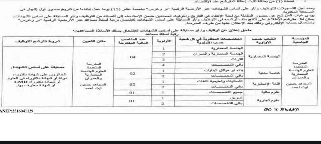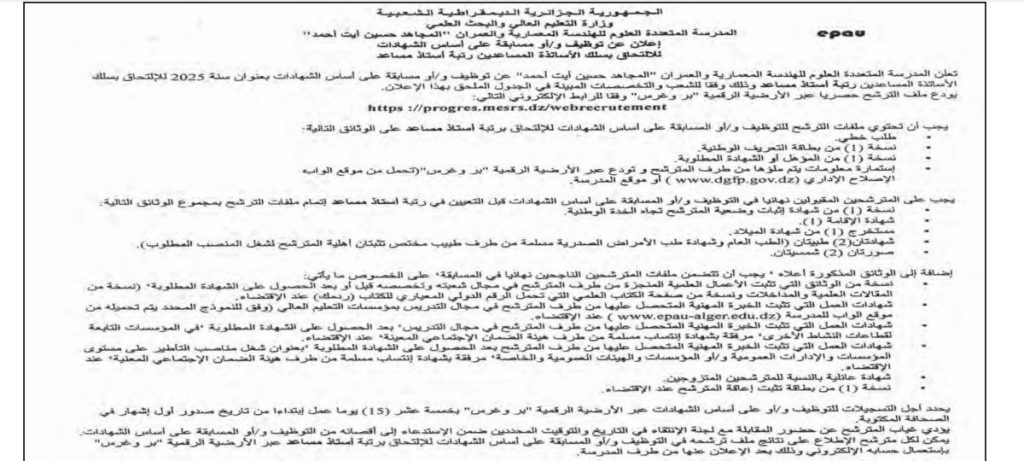تعلن المدرسة المتعددة العلوم للهندسة المعمارية والعمران “المجاهد حسين آيت أحمد” عن توظيف و/أو مسابقة على أساس الشهادات بعنوان سنة 2025 للالتحاق بسلك الأساتذة المساعدين رتبة أستاذ مساعد وذلك وفقاً للشعب والتخصصات المبينة في الجدول الملحق بهذا الإعلان.