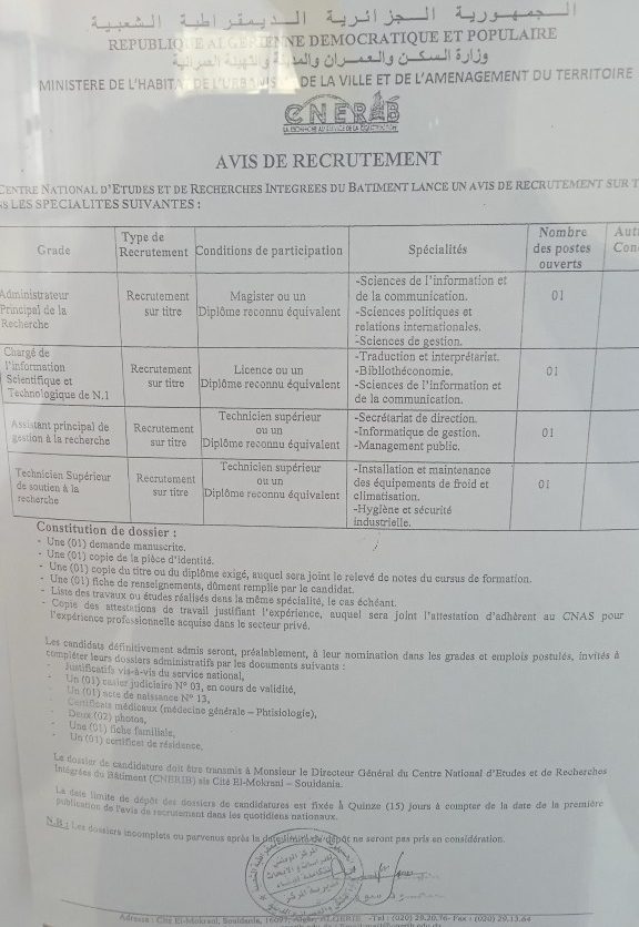 يعلن المركز الوطني للدراسات والأبحاث المتكاملة للبناء – الجزائر CNERIB عن إجراء توظيف على أساس الشهادة لشغل المناصب والتخصصات التالية: