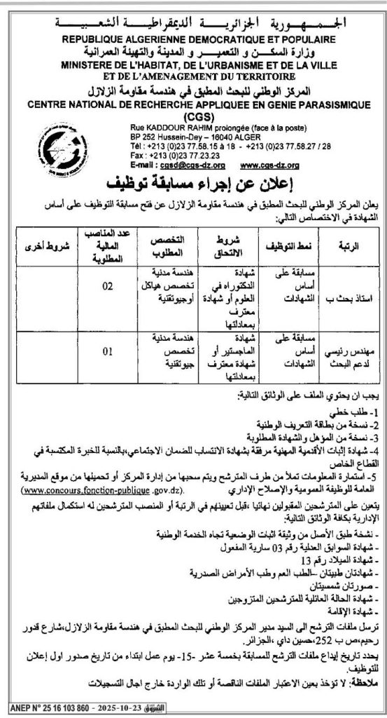 يعلن المركز الوطني للبحث المطبق في هندسة مقاومة الزلازل عن فتح مسابقة توظيف على أساس الشهادة في الإختصاصات التالي: