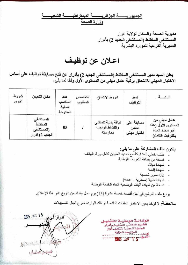 عامل مهني من المستوى الأول (عقد غير محدد المدة بالتوقيت الكامل) | مسابقة على أساس اختبار مهني | لياقة بدنية تتماشى والنشاط الواجب ممارسته | / | 05 | المستشفى المختلط (المستشفى الجديد 2) أدرار |