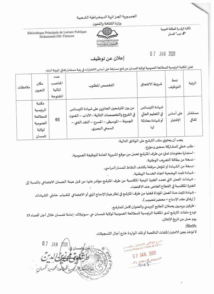 | مستشار ثقافي | على أساس الاختبار | شهادة الليسانس في التعليم العالي أو شهادة معادلة لها | من بين المترشحين الحائزين على شهادة الليسانس في الفروع والتخصصات التالية: الآداب – الفنون الجميلة – الموسيقى – المسرح – النقد الفني – السمعي البصري. | 01 | المكتبة الرئيسية للمطالعة العمومية لولاية تلمسان |