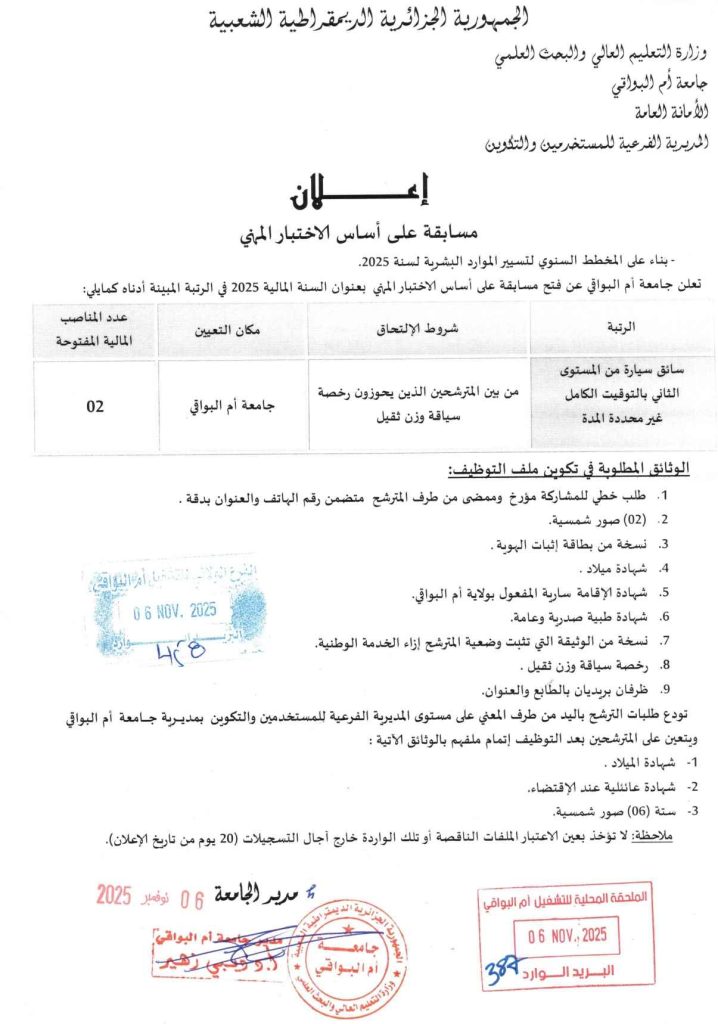 | سائق سيارة من المستوى الثاني بالتوقيت الكامل غير محددة المدة | من بين المترشحين الذين يحوزون رخصة سياقة وزن ثقيل | جامعة أم البواقي | 02 |