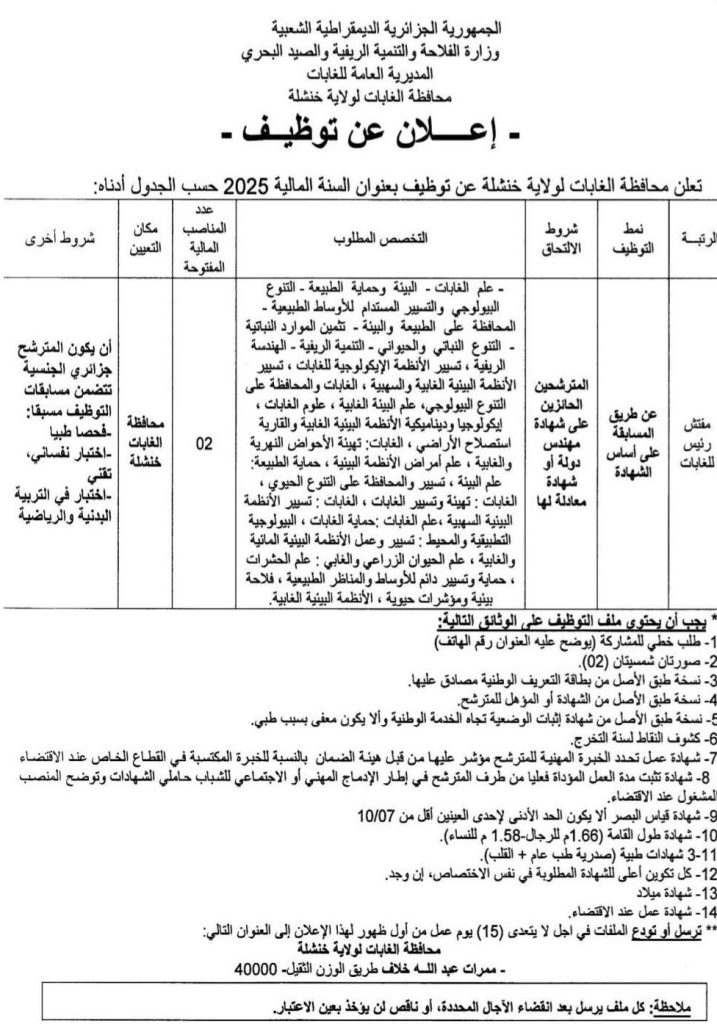 تعلن محافظة الغابات لولاية خنشلة عن توظيف بعنوان السنة المالية 2025 حسب الجدول أدناه: