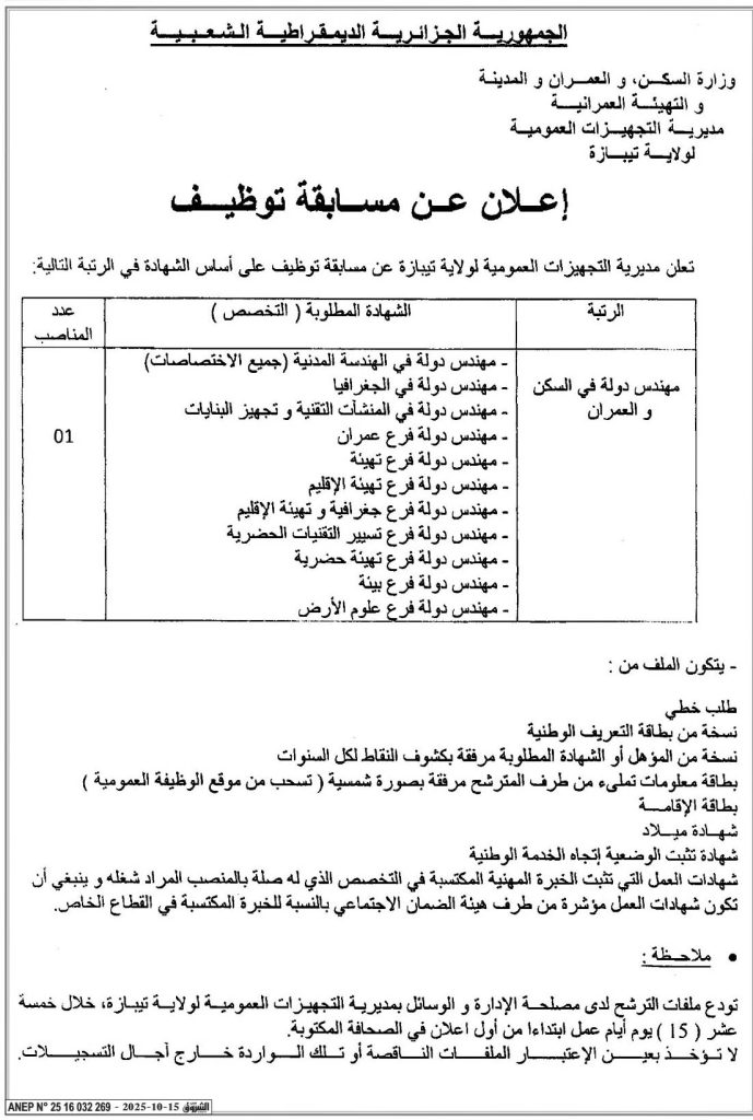 - إعلان عن مسابقة توظيف بمديرية التجهيزات العمومية لولاية تيبازة