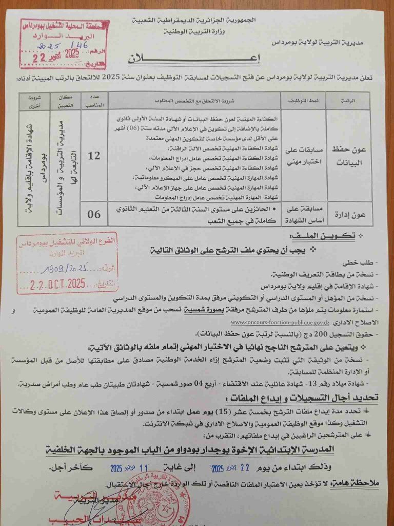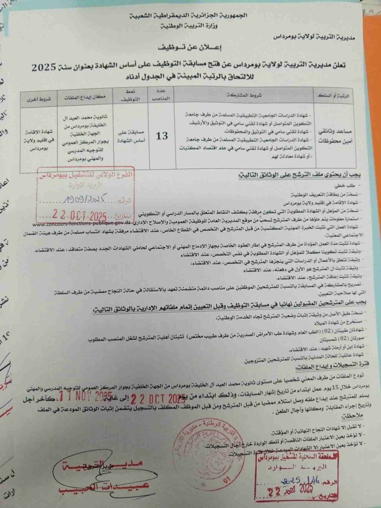 تعلن مديرية التربية لولاية بومرداس عن فتح مسابقة توظيف على أساس الشهادة بعنوان سنة 2025 للالتحاق بالرتبة المبينة في الجدول أدناه: