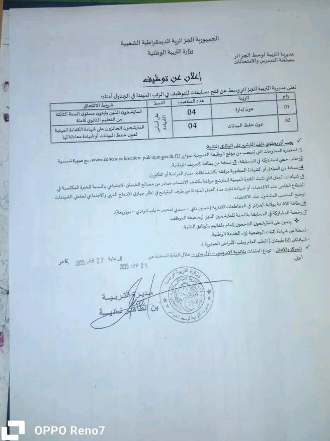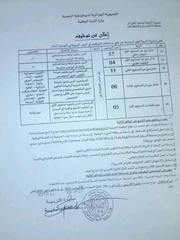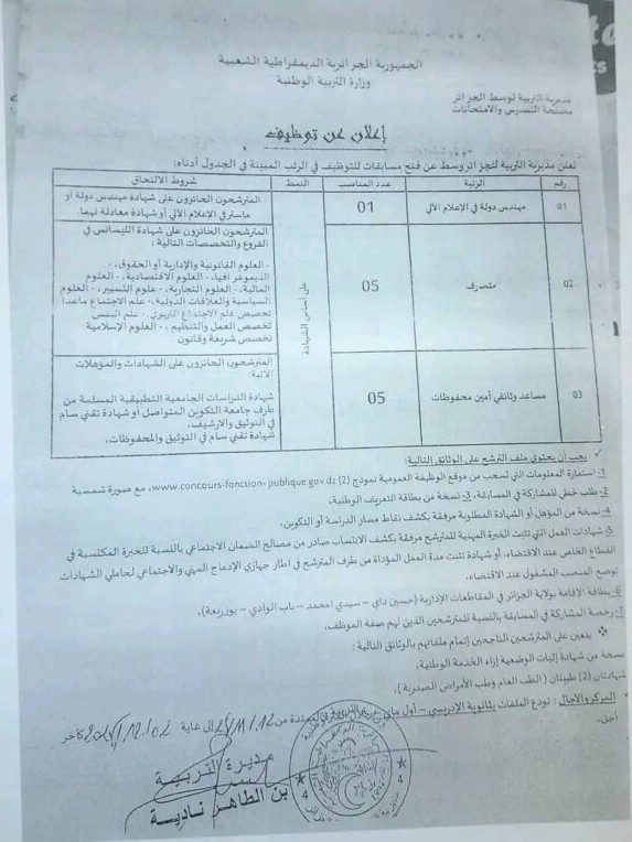 إعلان عن مسابقة توظيف بمديرية التربية للجزائر وسط (إداريين وعمال مهنيين)