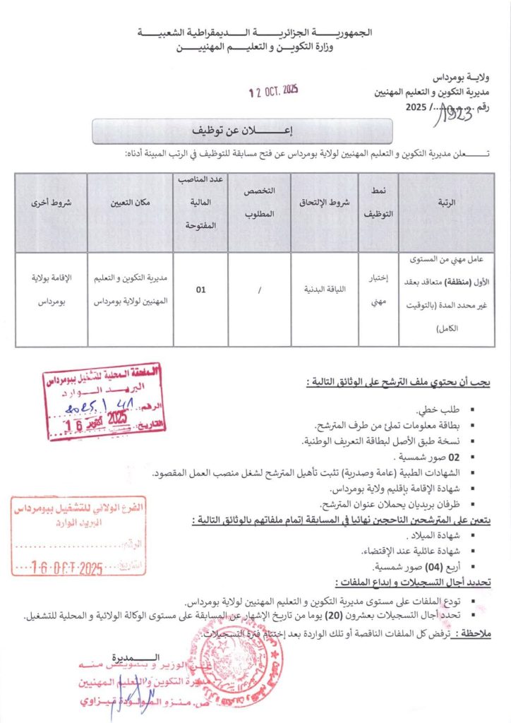 إعلان عن مسابقة توظيف بمديرية التكوين والتعليم المهنيين لولاية بومرداس