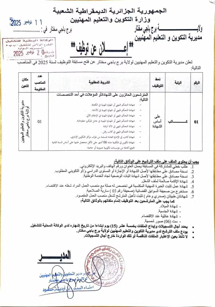 تعلن مديرية التكوين والتعليم المهنيين لولاية برج باجي مختار عن فتح مسابقة للتوظيف لسنة 2025 في المناصب التالية: