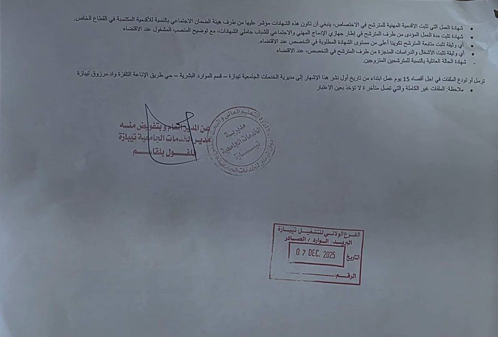 ترسل أو تودع الملفات في أجل أقصاه 15 يوم عمل ابتداء من تاريخ أول نشر هذا الإشهار إلى مديرية الخدمات الجامعية تيبازة – قسم الموارد البشرية – حتى طريق الإذاعة الثالثة واد مرزوق تيبازة .
