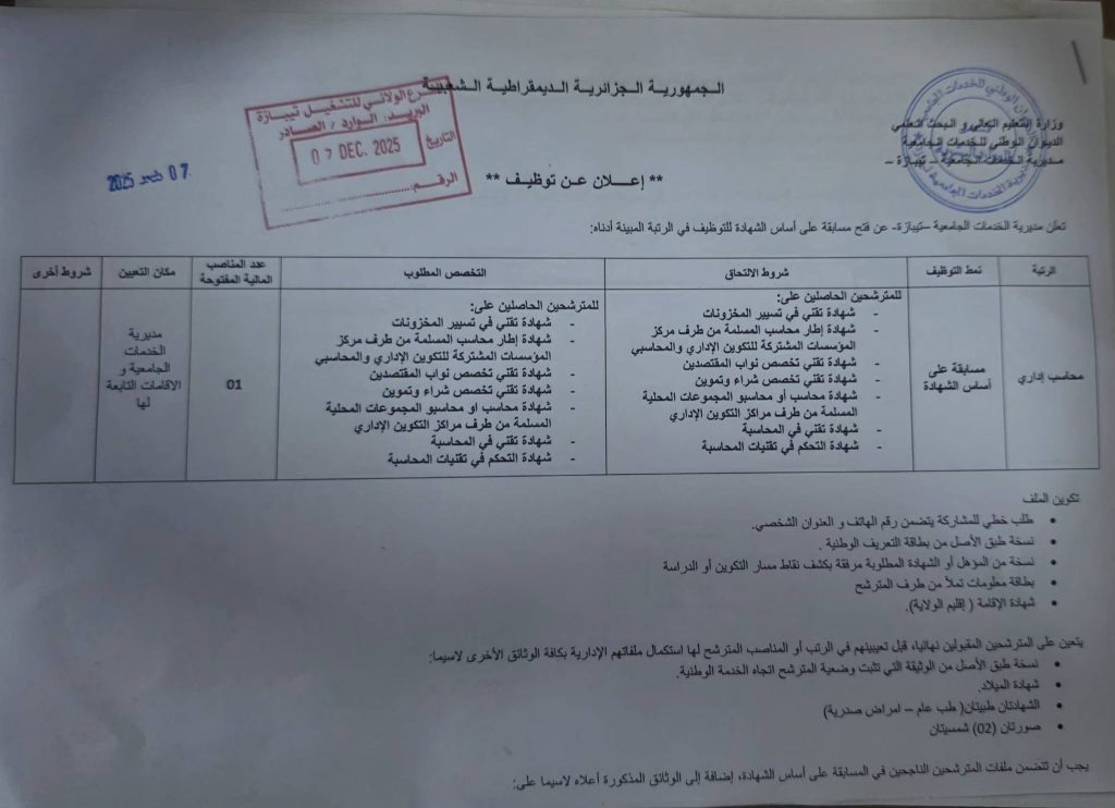 محاسب إداريمسابقة على أساس الشهاداتللمترشحين الحاصلين على: * شهادة تقني في تسيير المخزونات * شهادة إطار محاسب المسلمة من طرف مركز المؤسسات المشتركة للتكوين الإداري والمحاسبي * شهادة تقني تخصص نوادي المتعفنين * شهادة تقني تخصص شراء وتموين * شهادة محاسب أو محاسب المجموعات المحلية المسلمة من طرف مراكز التكوين الإداري * شهادة تقني في المحاسبة * شهادة التحكم في تقنيات المحاسبةللمترشحين الحاصلين على: * شهادة تقني في تسيير المخزونات * شهادة إطار محاسب المسلمة من طرف مركز المؤسسات المشتركة للتكوين الإداري والمحاسبي * شهادة تقني تخصص نوادي المتعفنين * شهادة تقني تخصص شراء وتموين * شهادة محاسب أو محاسب المجموعات المحلية المسلمة من طرف مراكز التكوين الإداري * شهادة تقني في المحاسبة * شهادة التحكم في تقنيات المحاسبة01مديرية الخدمات الجامعية أو الإقامات التابعة لها