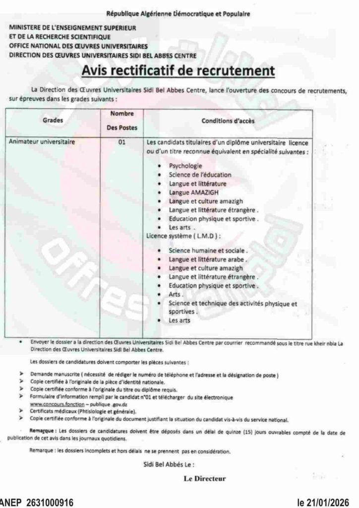 تعلن مديرية الخدمات الجامعية سيدي بلعباس وسط، عن فتح المسابقات للتوظيف على أساس الاختبارات في الرتب التالية:
