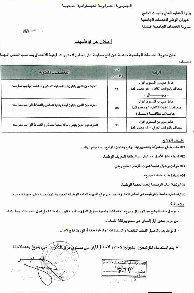 تعلن مديرية الخدمات الجامعية خنشلة عن فتح مسابقة على أساس الاختبارات المهنية للالتحاق بمناصب الشغل المبينة أدناه: