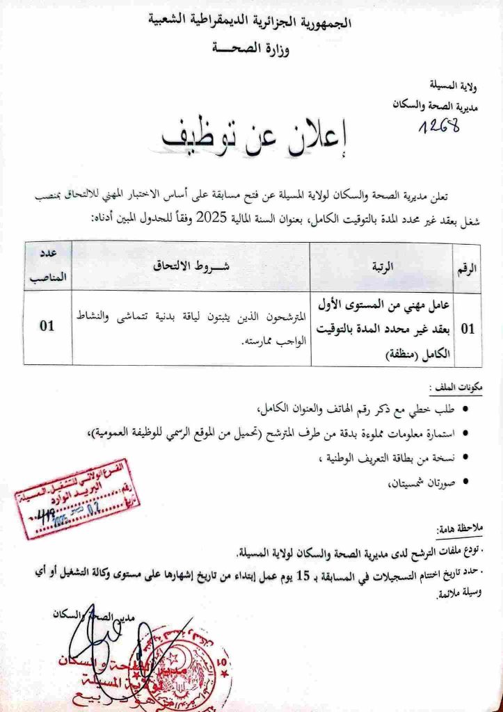تعلن مديرية الصحة والسكان لولاية المسيلة عن فتح مسابقة على أساس الاختبار المهني للالتحاق بمنصب شغل بعقد غير محدد المدة بالتوقيت الكامل، بعنوان السنة المالية 2025 وفقاً للجدول المبين أدناه: