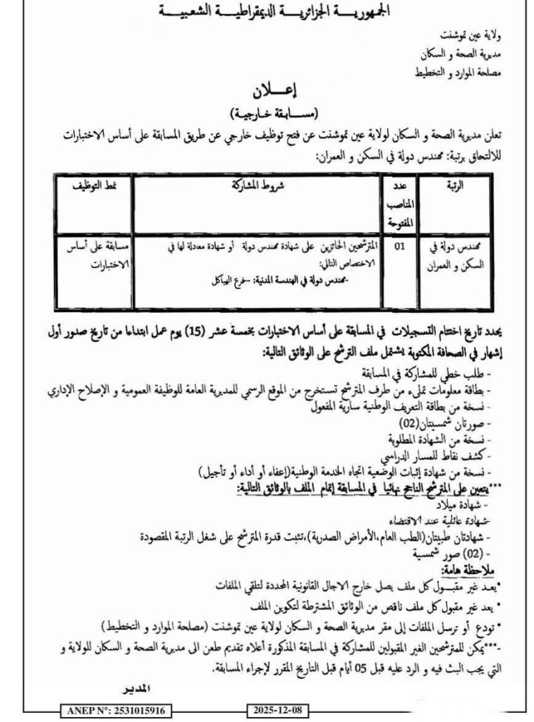 تعلن مديرية الصحة و السكان لولاية عين تموشنت عن فتح توظيف خارجي عن طريق المسابقة على أساس الإختبارات للالتحاق برتبة: مهندس دولة في السكن و العمران: