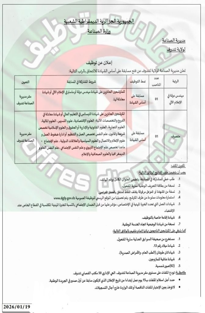 ملاحظة: تودع الملفات على مستوى مقر مديرية الصناعة لتندوف، الحي الإداري 50 مكتب القصابي تندوف.