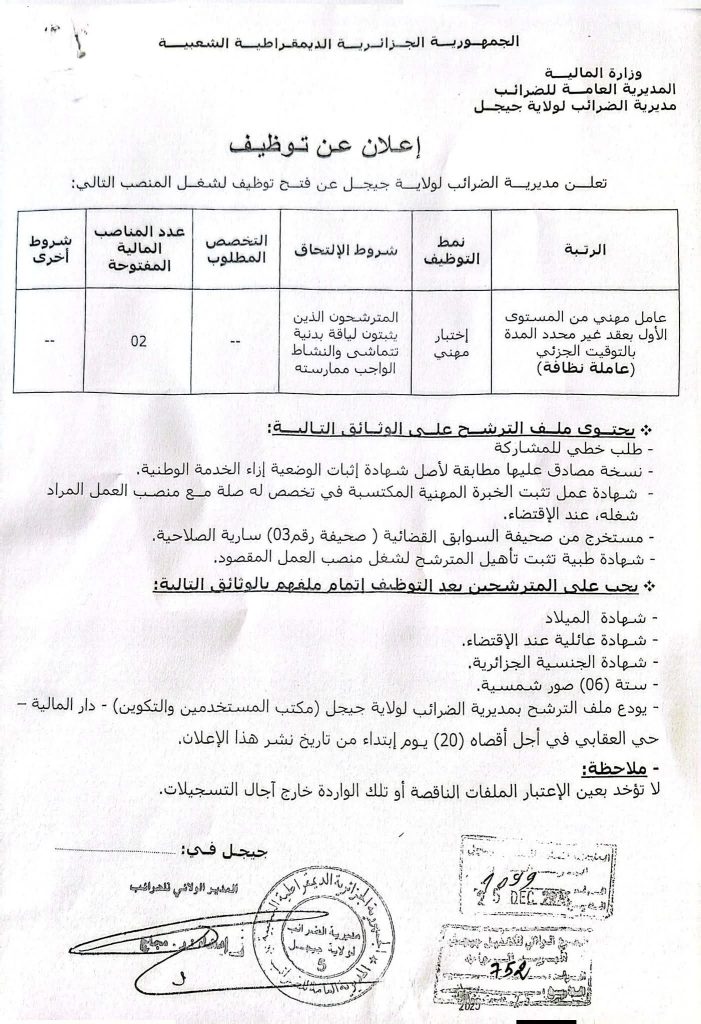 تعلن مديرية الضرائب لولاية جيجل عن فتح توظيف لشغل المنصب التالي: