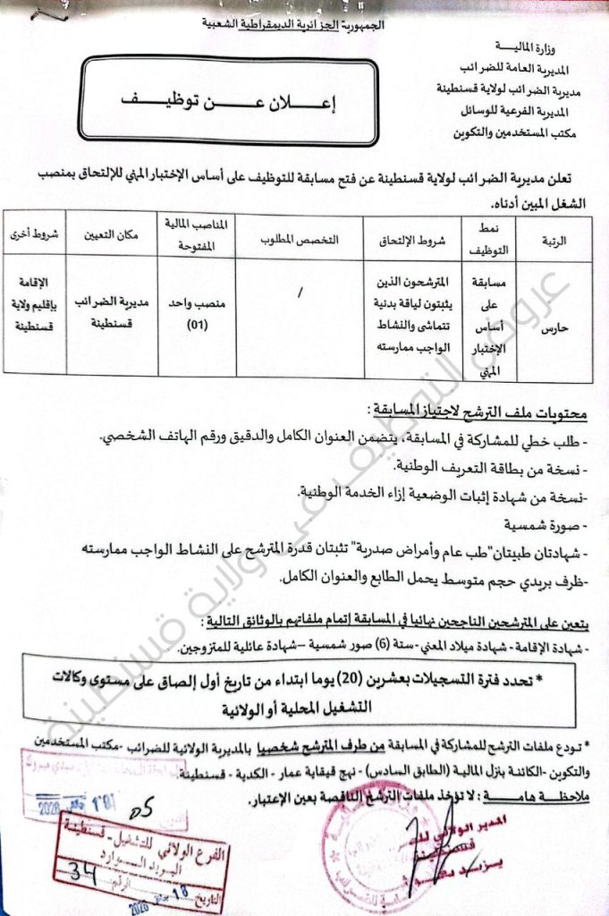 حارسمسابقة على أساس الاختبار المهنيالمترشحون الذين يثبتون لياقة بدنية تتماشى والنشاط الواجب ممارسته/منصب واحد (01)مديرية الضرائب قسنطينةالإقامة بإقليم ولاية قسنطينة