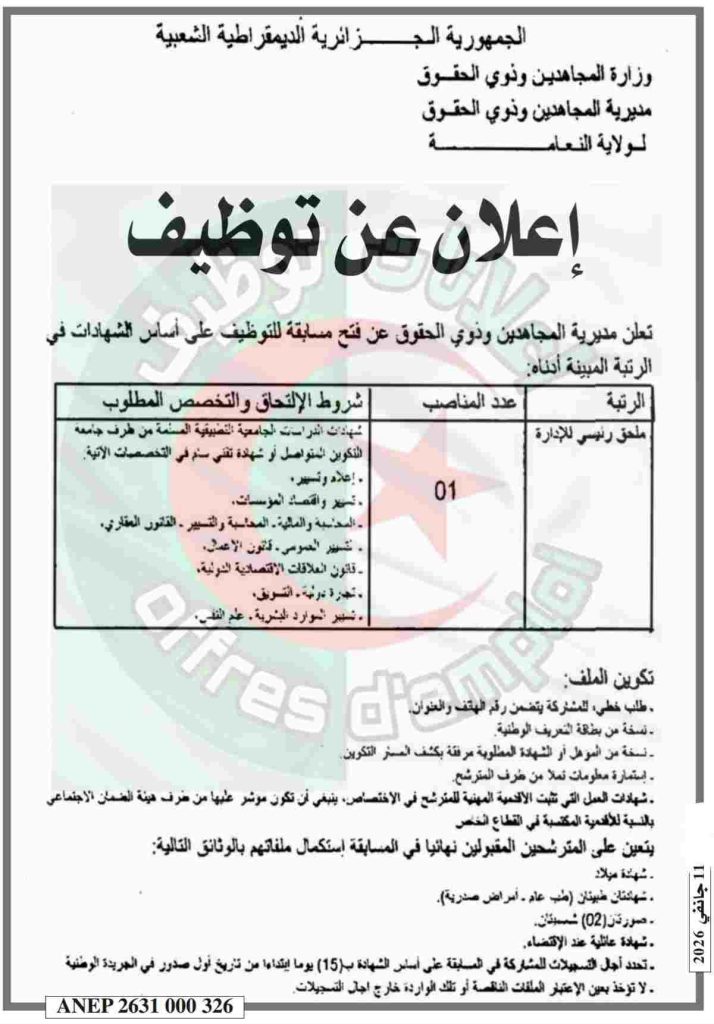 تعلن مديرية المجاهدين وذوي الحقوق عن فتح مسابقة للتوظيف على أساس الشهادات في الرتبة المبينة أدناه: