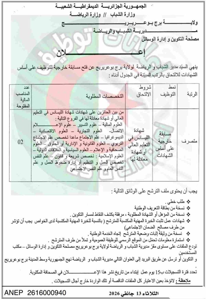 ينهي السيد مدير الشباب والرياضة لولاية برج بوعريريج عن فتح مسابقة خارجية للتوظيف على أساس الشهادات للالتحاق بالرتب المبينة في الجدول أدناه: