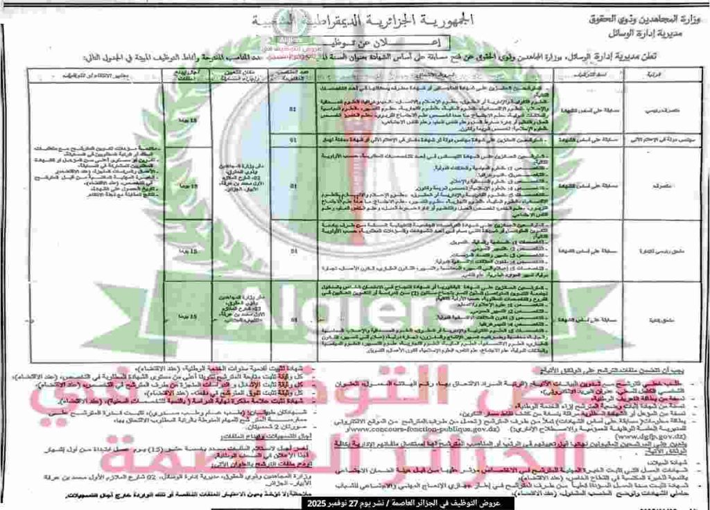 - إعلان عن مسابقة توظيف بمقر وزارة المجاهدين و ذوي الحقوق الجزائر العاصمة
