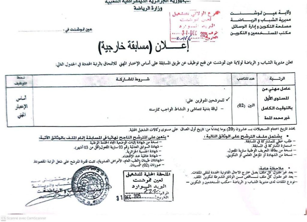 تعلن مديرية الشباب والرياضة لولاية عين تموشنت عن فتح توظيف عن طريق المسابقة على أساس الاختبار المهني للالتحاق بالرتبة المحددة في الجدول التالي: