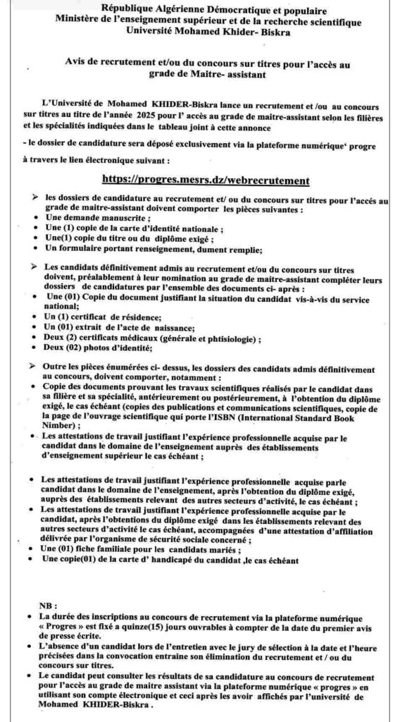 تعلن جامعة محمد خيضر- بسكرة عن فتح باب التوظيف و/أو المسابقة على أساس الشهادات بعنوان سنة 2025 للالتحاق برتبة أستاذ مساعد قسم “ب” حسب الفروع والتخصصات المذكورة في الجدول المرفق بهذا الإعلان.