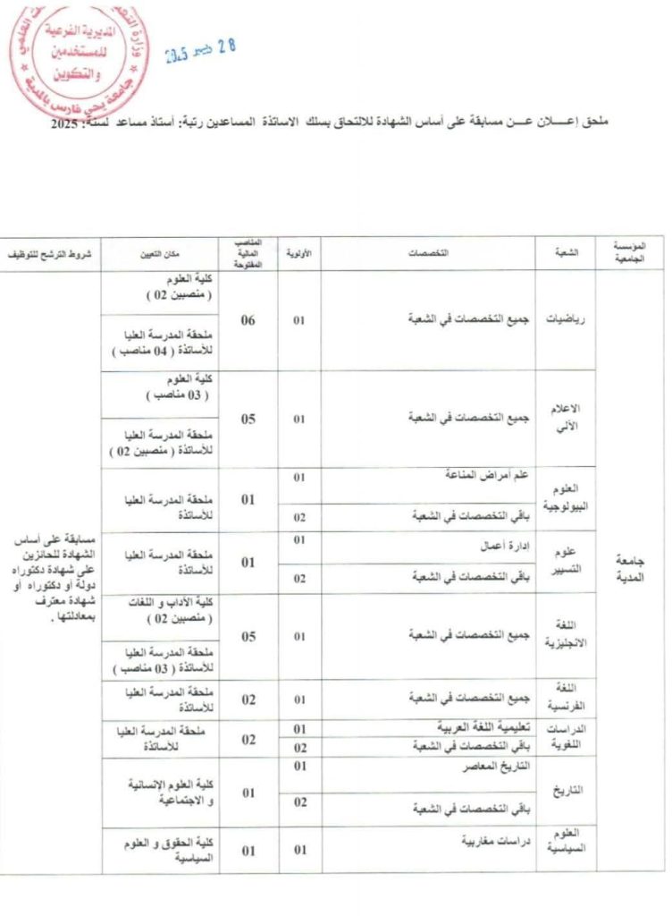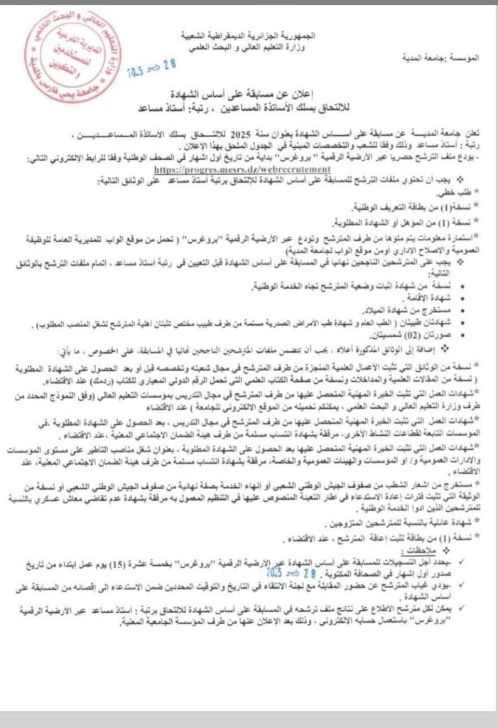 تعلن جامعة المدية عن مسابقة على أساس الشهادة بعنوان سنة 2025 للالتحاق بسلك الأساتذة المساعدين، رتبة: أستاذ مساعد قسم “ب” وذلك وفقا للشعب والتخصصات المبينة في الجدول الملحق بهذا الإعلان.
