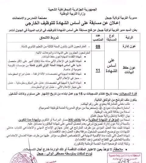 يعلن السيد مدير التربية لولاية جيجل عن فتح مسابقة على أساس الشهادة للتوظيف في الرتب المبينة في الجدول أدناه: