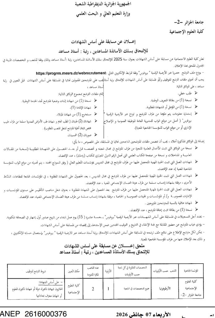 تعلن كلية العلوم الاجتماعية عن مسابقة على أساس الشهادات بعنوان سنة 2025 للإلتحاق بسلك الأساتذة المساعدين، رتبة: أستاذ مساعد وذلك وفقا للشعب و التخصصات المبينة في الجدول الملحق بهذا الإعلان.