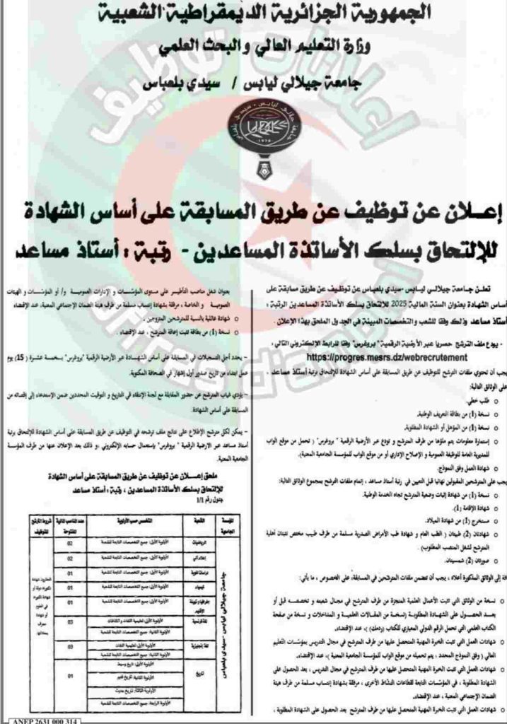 تعلن جامعة جيلالي ليابس – سيدي بلعباس عن توظيف عن طريق مسابقة على أساس الشهادة بعنوان السنة المالية 2025 للالتحاق بسلك الأساتذة المساعدين الرتبة: أستاذ مساعد وذلك وفقا للشعب والتخصصات المبينة في الجدول الملحق بهذا الإعلان.