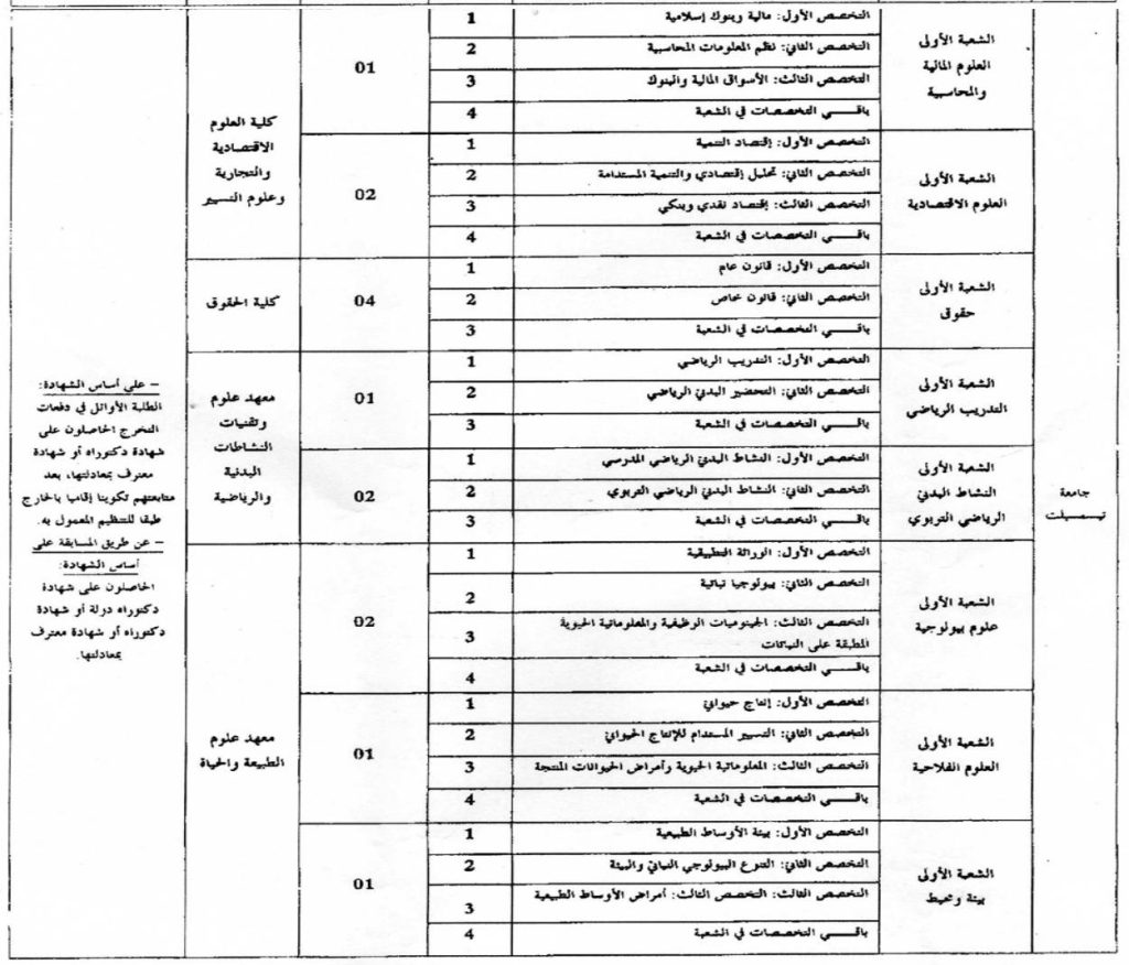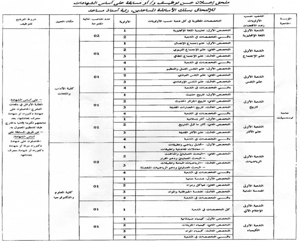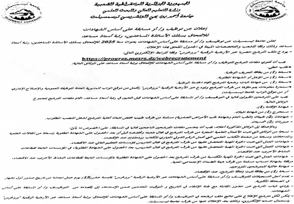 تعلن جامعة تيسمسيلت عن توظيف و/ أو مسابقة على أساس الشهادات بعنوان سنة 2025 للالتحاق بسلك الأساتذة المساعدين، رتبة أستاذ مساعد قسم “ب” وذلك وفقا للشعب والتخصصات المبينة في الجدول الملحق بهذا الإعلان.