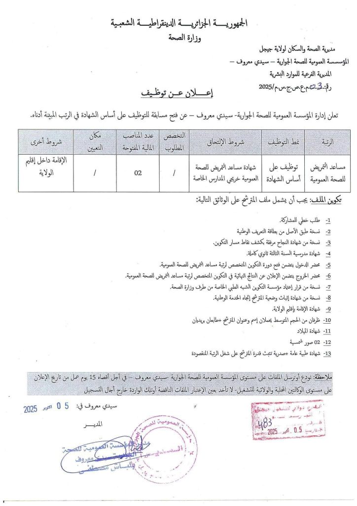 ملاحظة: تودع أو ترسل الملفات على مستوى المؤسسة العمومية للصحة الجوارية – سيدي معروف – في أجل أقصاه 15 يوم عمل من تاريخ الإعلان على مستوى الوكالات المحلية والولائية للتشغيل – لا تأخذ بعين الاعتبار الملفات الناقصة أو تلك التي خارج الآجال.