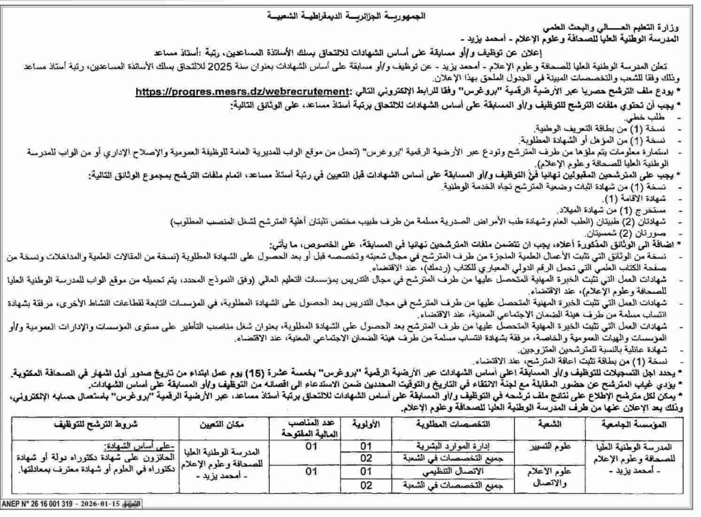 تعلن المدرسة الوطنية العليا للصحافة وعلوم الإعلام – أحمد يزيد – عن توظيف و/أو مسابقة على أساس الشهادات بعنوان سنة 2025 للالتحاق بسلك الأساتذة المساعدين، رتبة أستاذ مساعد وذلك وفقا للشعب والتخصصات المبينة في الجدول الملحق بهذا الإعلان.