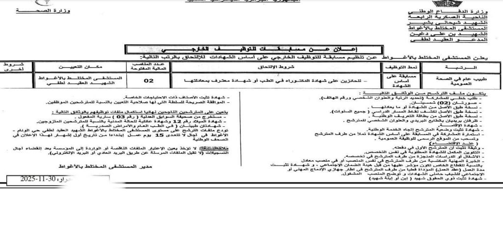 | طبيب عام في الصحة العمومية | مسابقة على أساس الشهادة | للحائزين على شهادة الدكتوراه في الطب أو شهادة معترف بمعادلتها | 02 | المستشفى المختلط بالأغواط (الشهيد العقيد لطفي) |