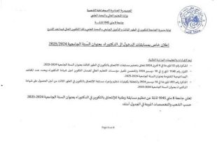 الجمهورية الجزائرية الديمقراطية الشعبية وزارة التعليم العالي والبحث العلمي جامعة 8 ماي 1945 قالمة ads نيابة مديرية الجامعة للتكوين في الطور الثالث والتأهيل الجامعي والبحث العلمي وكذا التكوين العالي فيما بعد التدرج إعلان خاص بمسابقات الدخول إلى الدكتوراه بعنوان السنة الجامعية 2024/2025 تبعا للقرارات …