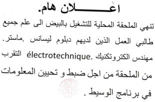 أكمل القراءة »يرجى من طالبي العمل الذين لديهم دبلوم ليسانس .ماستر. مهندس الكتروتكنيك électrotechnique التقرب من الملحقة من أجل ضبط و تحيين المعلومات في برنامج الوسيط
