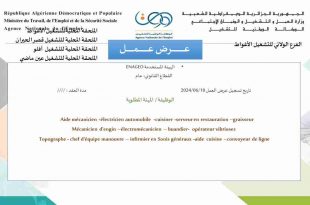 الجمهورية الجزائرية الديمقراطية الشعبيةوزارة العمل، والتشغيل، والضمان الاجتماعيالوكالة الوطنية للتشغيلالملحقة المحلية للتشغيل ببرج بوعريريج ads تعلن الملحقة المحلية للتشغيل طالبي العمل المودعين في القائمة الاسمية لدى المؤسسة الوطنية لتجهيزات ورشة 60 للتخصصات التالية: ممرض (infirmier) ميكانيكي هيدروليك (mécanicien hydraulicien) موجه رافعة (catputsher) بأن الفحص …