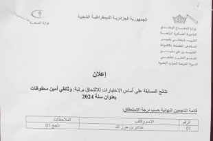 اعلان ads وزارة الدفــــاع الوطني |الناحية العسكرية الرابعــة الشهيد شيحاني بشير |المستشفى المختلط بالأغواط الشهيد بن علي دغيـن المدعــو العقيد لطفــــي نتائج المسابقة على أساس الاختبارات للالتحاق بالرتب التالية متصرف محلل متصرف بيولوجي للصحة العمومية من الدرجة الثانية وثائقي امين محفوظات مديرية التربية تفتح …